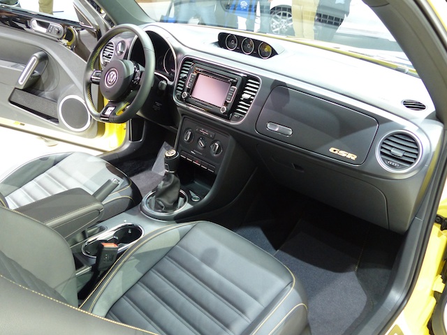 Drawing on the original yellow and black stylings of the 1970’s version, the 2014 Volkswagen Beetle GSR features the same fun colors but with a modern update in their application. The body and bumpers are yellow with a hood that’s primarily black as are the trunk lid, roof and mirror caps. It also features “GSR” lettering over the side skirts and a big rear spoiler .