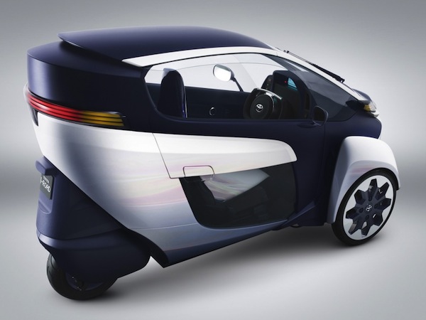The Toyota i-Road is 7.7′ long, 4.7′ high and 2.8′ wide, and weighs just over 660 pounds. Despite its compact size, there is room for two adults to sit side-by-side. The enclosed design makes the whole thing more car-like and also means you don’t need to wear a helmet.
