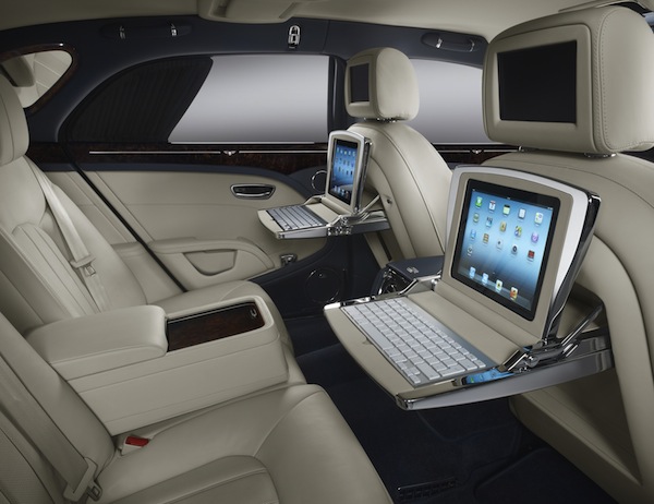 The Bentley Mulsanne came to the New York Auto Show with enhanced technology, comfort and entertainment features including picnic tables designed specifically for holding an iPad along with a wireless keyboard. The cabin can serve as a Wi-Fi hotspot and there’s even bespoke fitted luggage.