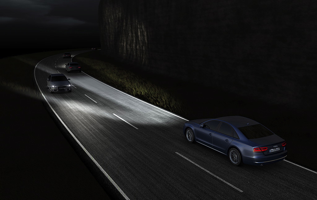 Audi shows us the front wheel with ceramic brake rotors hiding within. They also show off the new all LED headlight design. These headlights are not only for style. They are capable of intelligent lighting patterns to improve night driving for all drivers, not just the pilot of the new A8/S8. Audi will surely not disappoint with a host of latest technology throughout the new A8 and S8. But will the Audi have interior smell control like on the new Merc?