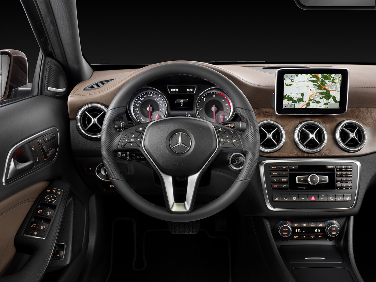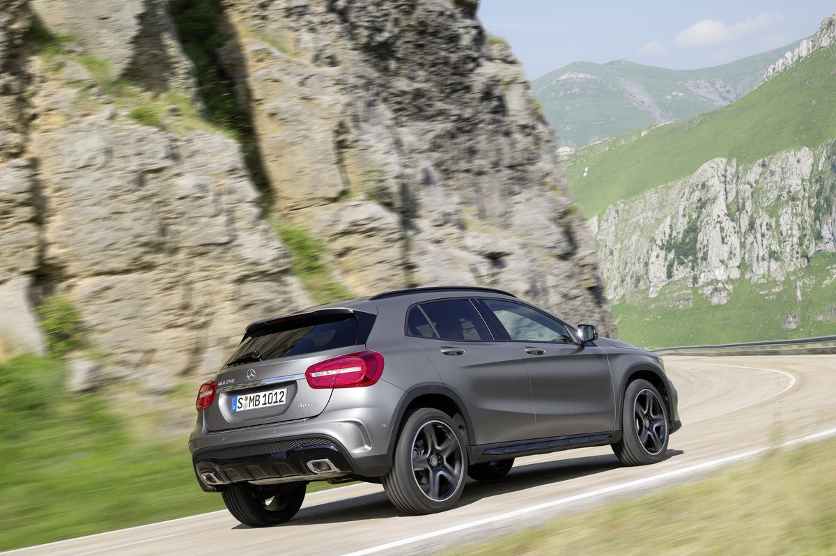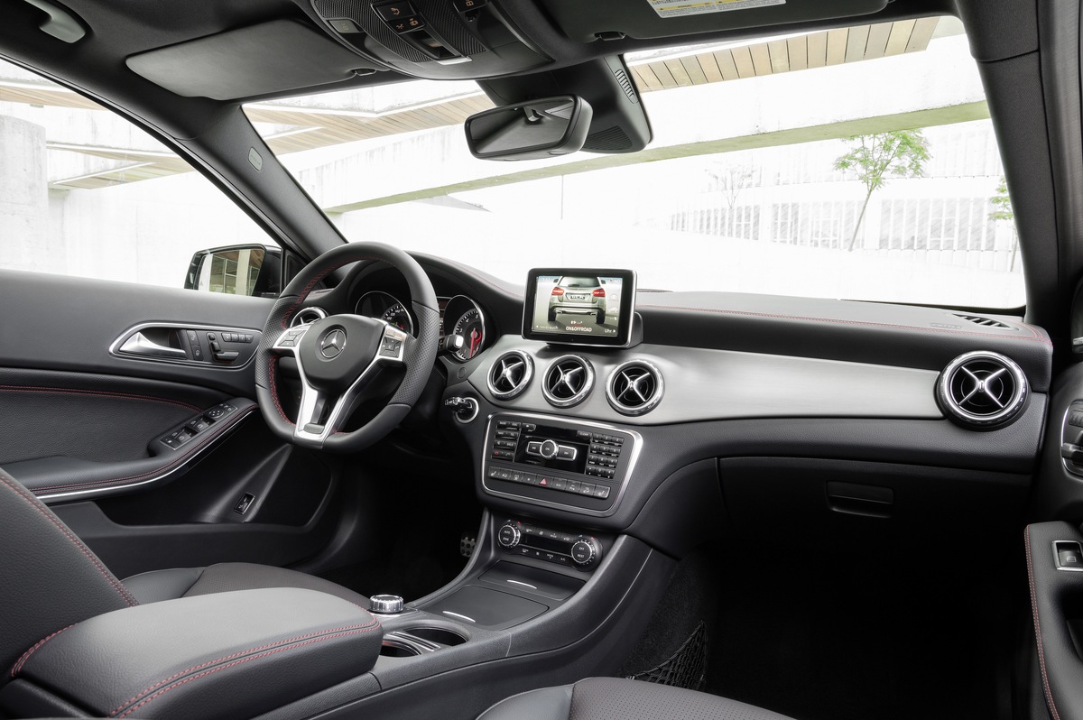 The GLA is a compact little thing. Its 173.9 in total length is about 2.5 inches shorter than the 2014 BMW X1. However, this is 1.5 inches longer than the still to arrive in the US Audi Q3. The GLA enjoys the same 2.0-liter turbocharged engine as the new CLA. It makes a healthy 208 horsepower and 258 lb-ft of torque. And full torque comes in very early at 1,250 rpm. This little crossover also ushers in the use of Mercedes new permanent 4MATIC system with fully variable torque distribution.