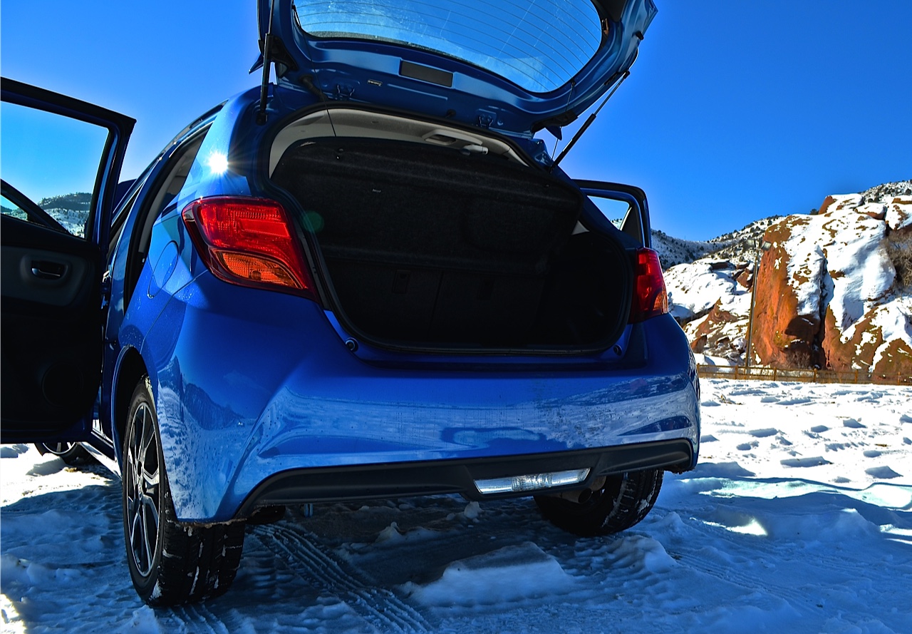 The rear seats fold nearly flat, which allows for a tremendous amount of cargo space. Even with the rear seats up, the 2015 Toyota Yaris can accommodate one and a half sets of golf clubs or a full-size dog bed. Though rear seat room is good for the class, legroom up front does suffer, especially when equipped with a manual transmission.