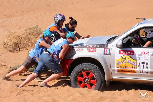 The only place competitors are allowed to work together is in the dunes. For the second time during the 2015 Rally, Team # 107, Jo Hannah and Susanah Hoehn and Team #218, Rachelle Croft and Rhonda Cahill, teamed up—this time for the Chegaga Dunes.