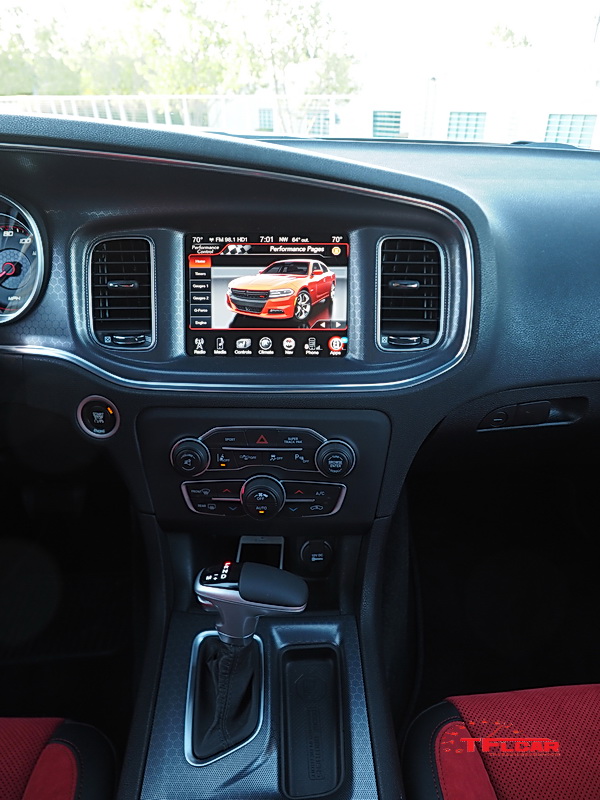 Inside, driver and passengers are treated to a more than comfortable cabin and a suite of technology features built into the Uconnect system and 8.4-inch touchscreen media center that will satisfy any technophile. With the R/T Road and Track trim, the driver can use the Uconnect system to activate launch control and view the performance pages – a system that records everything from g-force measurements, to acceleration times, and the level of power and torque at any given moment.