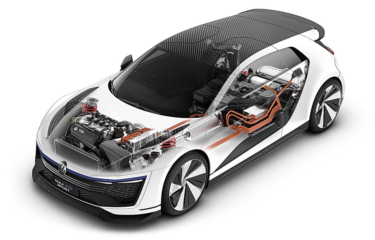 Underneath the sleek carbon fiber body panels of the Golf GTE Sport concept is a version of the engine that twice won the World Rally Championship – a 1.6-liter TSI engine with an output of 295 horsepower and 295 lb-ft of torque. The gasoline engine is assisted by two 113 horsepower electric motors mounted at the front and rear axles. Combined system power is 395 horsepower and 494 lb-ft of torque. Power is sent to all four wheels through a 6-speed DSG automatic transmission and “electric propshaft.”