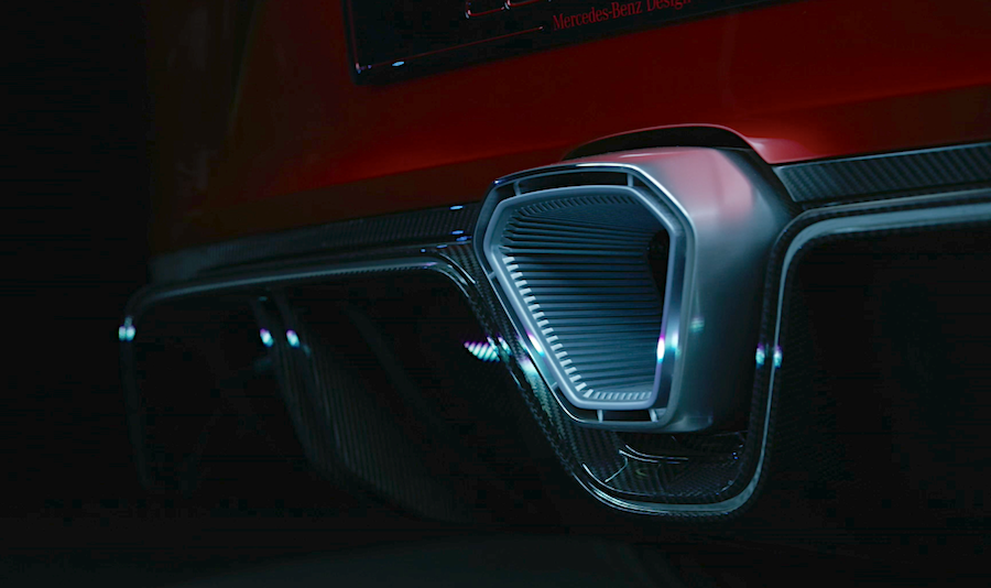 Mercedes-AMG releases a short teaser video that shows a brief “EQ Power” badge on the car’s side camera. EQ is a new term in Mercedes-Benz lexicon that stands for electric (EV) vehicles. The AMG division appears to have expanded the term to “EQ Power”. This is just a guess at this point, but this label could point to a high-performance gasoline/electric hybrid system that AMG is looking to employ for ever greater road performance. The concept does appear to have a single/center exhaust pipe (see closeup below).