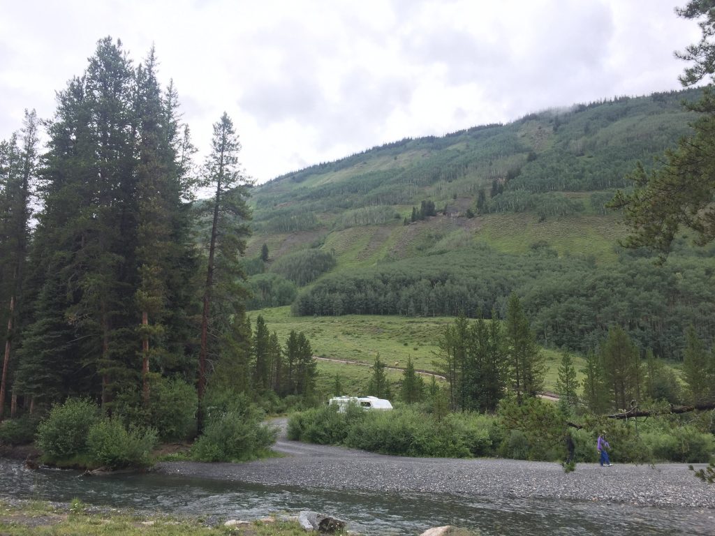 When we got to the campground, all of the sited along the banks of the river were reserved or occupied. However on the opposite bank, there was plenty of space. A creek crossing stood between us and those sites, but with the Aztek we were able to easily make it across the creek. The water was decently high too! At its deepest point it was slightly above the wheel wells.