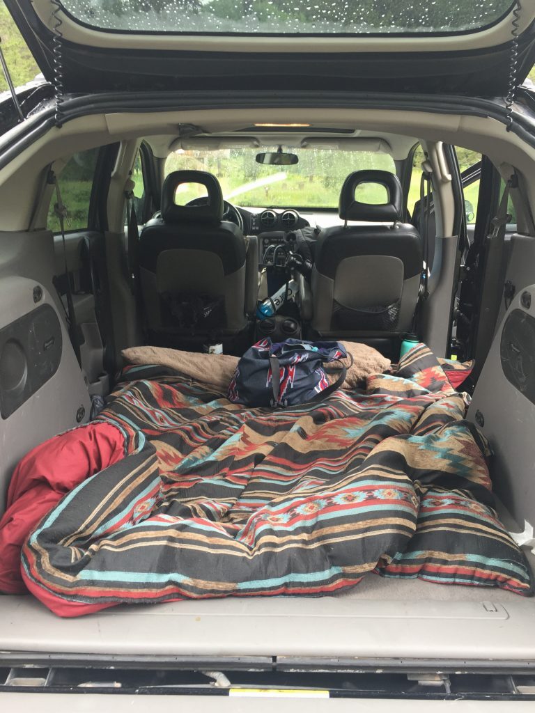 One of our tents has seen one too many music festivals and so two of us were left without a place to sleep. The options were: sleep in a hammock in the middle of bear country, or take out the removable back seats and sleep in the steel-clad safety of an early 2000’s GM product. We chose the latter.