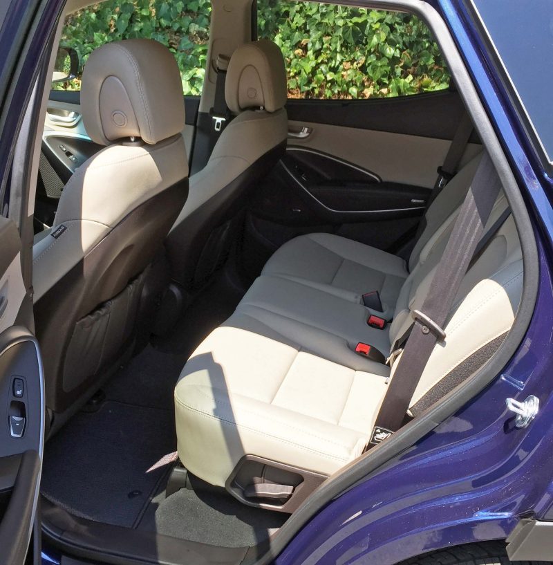 The Santa Fe Sport and longer Santa Fe are differentiated by the side view daylight opening (window shape). The latter Santa Fe features a shape that emphasizes the increase in passenger and cargo room behind the second row seating, with its own bodyside character lines from the “B” pillar back. The grille design also differs, as do the exhaust tips. The Santa Fe rolls on 18-inch wheels and comes with a flush -mounted tow hitch design.