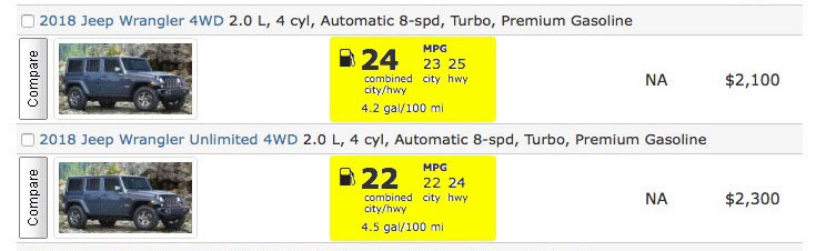 The EPA just published official fuel economy figures for the 2.0-liter Jeep Wrangler JL.