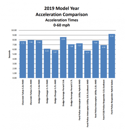 On the dynamics testing laps, four officers each drove five laps in each vehicle. After all that was said and done, their times were averaged into one lap time for each vehicle. Their lap times were also ranked in charts, along with acceleration and braking.