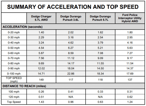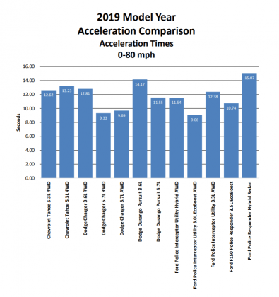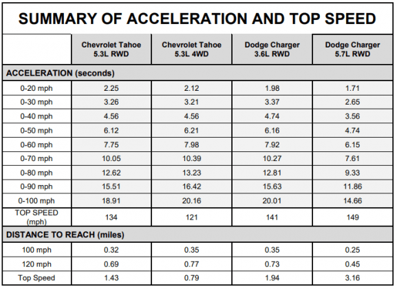 Michigan State Police tested all the vehicles in several acceleration runs, braking tests and dynamic testing laps. Each car was evaluated from 0-60, 0-80 and 0-100 mph, as well as by its top speed. In the braking test, they ran two phases of 60-0 runs with a 45 mph cooldown lap in between. Helpfully, the report includes details on their methodology.