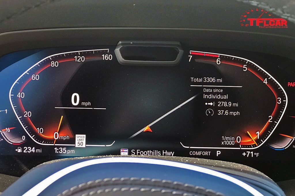 Mind you, the buttons to control the drive modes are down on the center console. The four Comfort, Sport, Eco Pro and Adaptive buttons are completely indistinguishable by feel, so you have to take your eyes off the road until you remember where they’re located. It would be nice to have a dial or just have one button cycle through the drive modes.