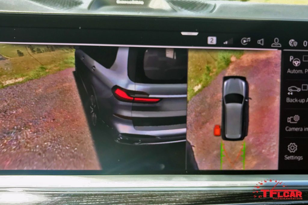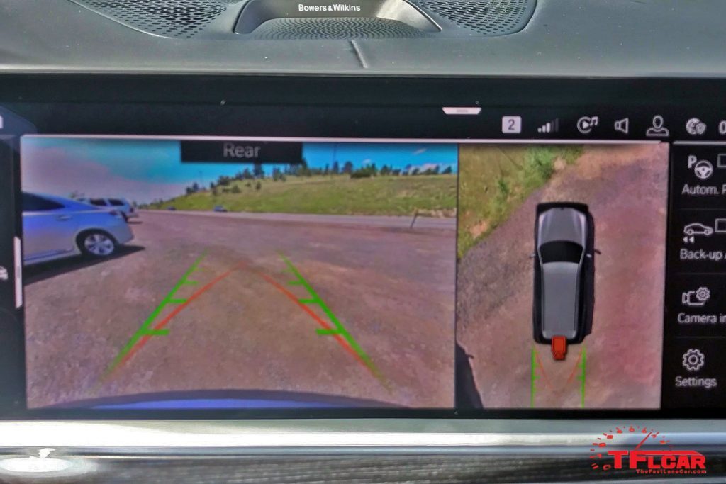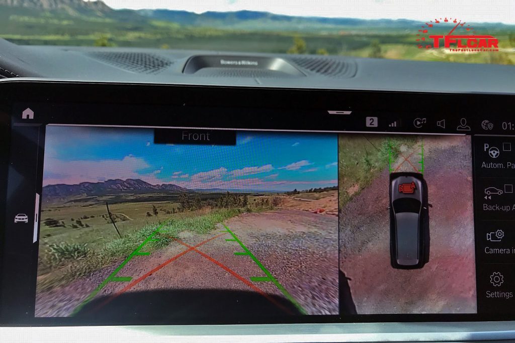 The 360-degree camera system, for example, is insanely useful. Provided you don’t use the Park Assist, which can be a bit finicky, you can chose the most pertinent camera views you need when backing into a parking space. The system even shows an image of the car next to a curb, so you can line up without scraping those massive wheels. See all the camera views below: