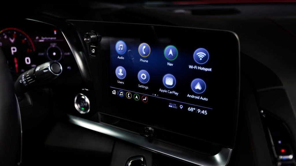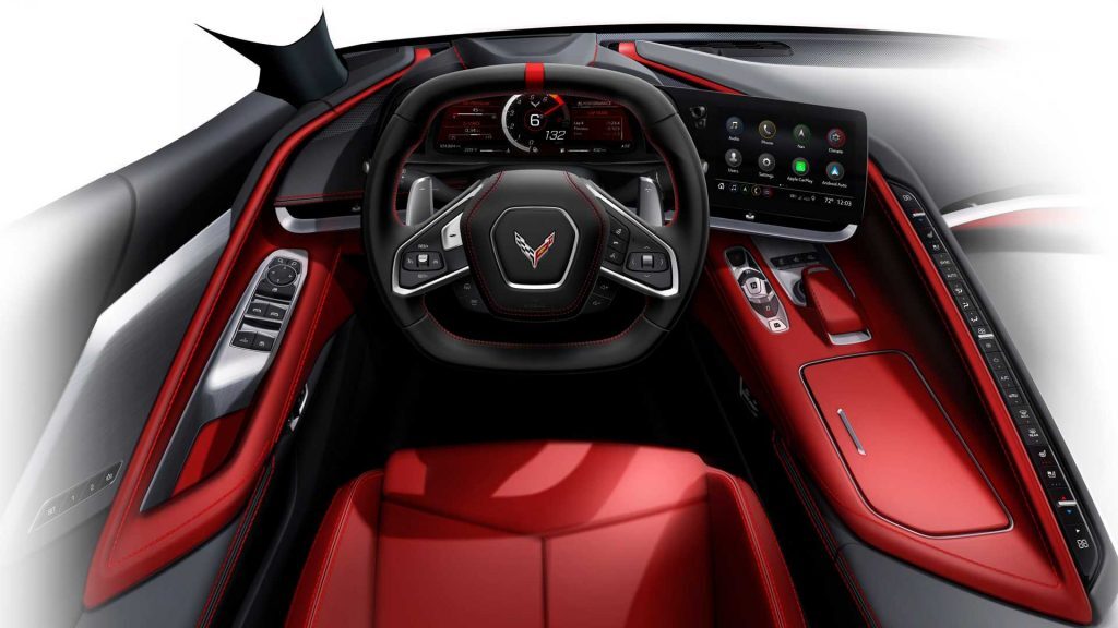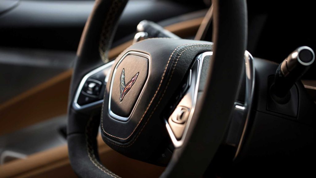 The Corvette’s interior also takes an exotic approach what we’ve been used to in older generations. Here, there’s a new squared off steering wheel, festooned in buttons with a two-spoke design and paddles for the eight-speed transmission. What also stands out is just how much of the interior is aimed toward the driver. The infotainment screen is sharply tilted toward the driver, and the digital instrument cluster is front in center of the cockpit design.
