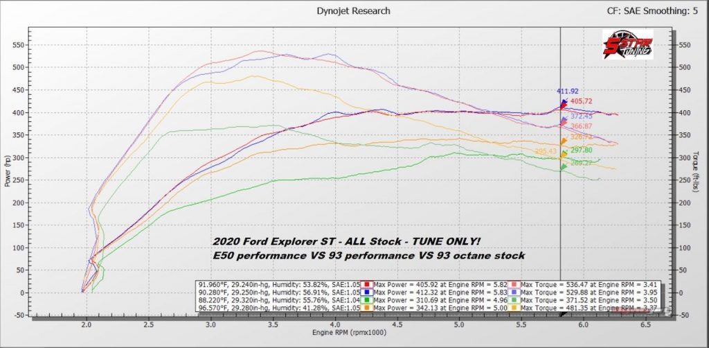 With only software updates, the folks at 5 Star Tuning eked out a substantial power boost over the stock Explorer ST. On an E50 tune (E85 mixed with 93 octane premium gasoline), the white Explorer ST in this video gains 100 horsepower and 165 lb-ft of torque at the wheels. Mind you, Ford’s 400 horsepower and 415 lb-ft figures are rated at the crank.