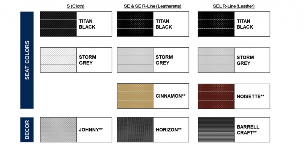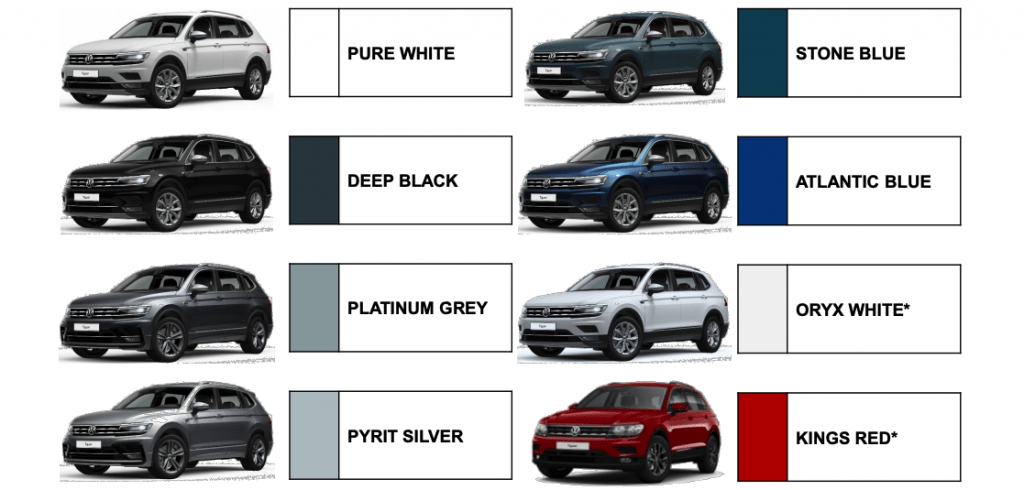 The 2022 Volkswagen Tiguan adds new color options, including Oryx White and Kings Red on the R-Line models. The interior options have been fleshed out as well, as shown below: