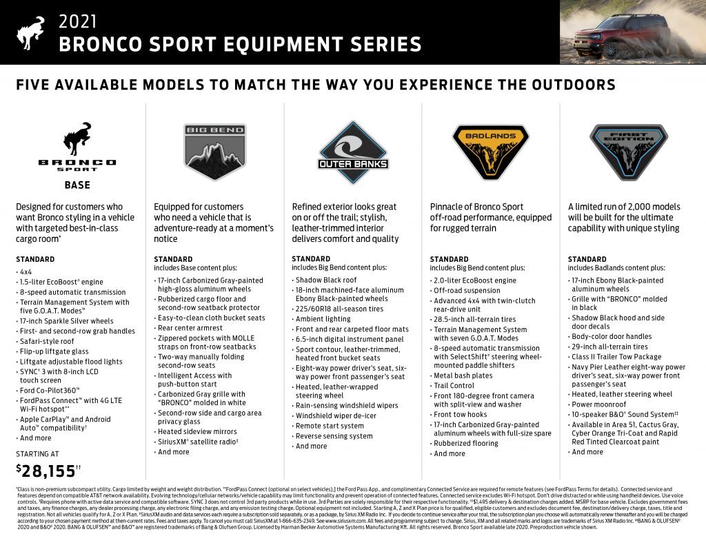 Ford will open orders for the Bronco Sport with four distinct trim levels, as well as a First Edition limited to a 2,000-unit production run. The base model, Big Bend and Outer Banks come with the smaller 1.5-liter engine, while the top-end Badlands and the First Edition get the larger 2.0-liter unit.