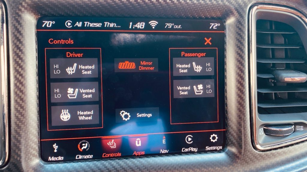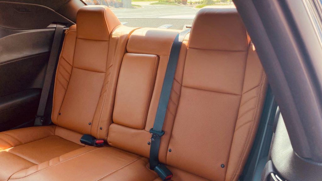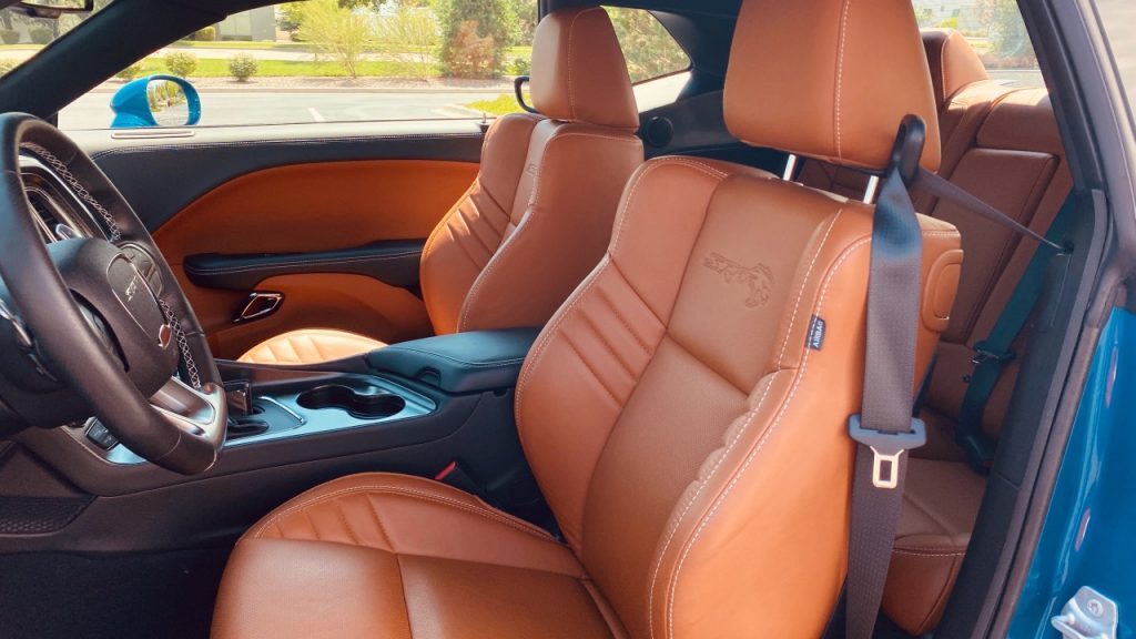 Heated “Houndstooth” cloth seats come standard, while the Laguna leather seats in our test car are a $1,795 option. The $2,095 Plus Package adds ventilated seats, premium stitched dash and door panels, as well as a power adjustable steering column. Other comfort upgrades include the $1,795 Harman Kardon Audio Group which adds an 18-speaker stereo system; a $1,295 Driver Convenience Group that adds blind-spot detection, HID headlights and power-folding mirrors; a $1,595 Carbon and Suede interior package; and the $795 Uconnect 4C Nav package. The “Warp Speed” granite wheels add $1,295 to the total price, while the SRT performance spoiler on the trunk is another $995.
