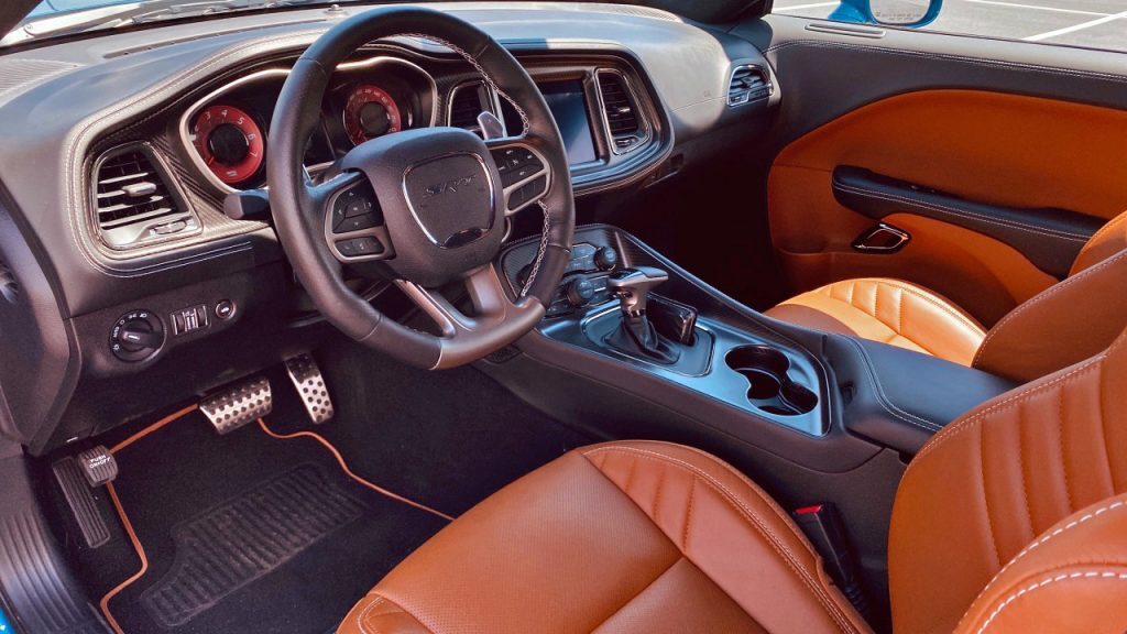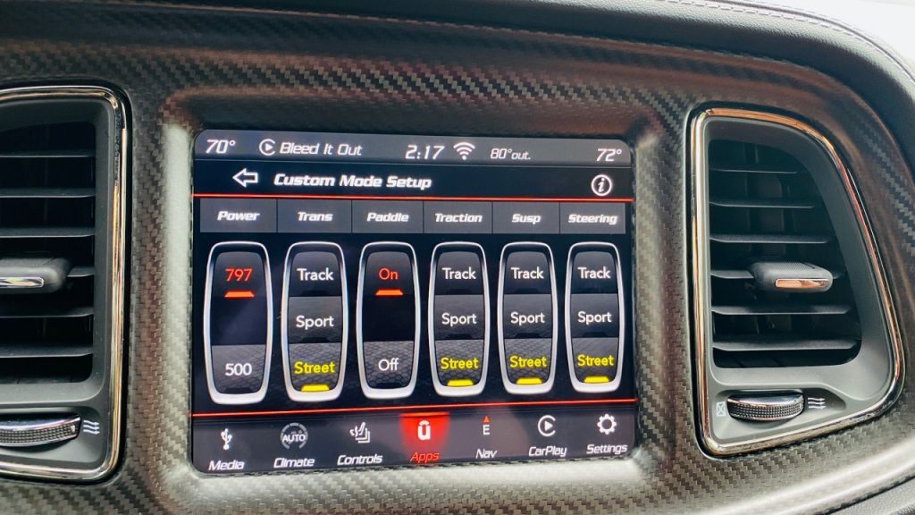 Even with the volcanic power at your disposal, the Challenger doesn’t strain at the leash like some high-strung performance cars. It’s still a big, comfortable American cruiser, with plush leather seats and a comfortable ride. Keep all the settings in “Street” mode, which you can do through the SRT Performance Pages shown below, and the Challenger works well as a long-distance cruiser. The adaptive suspension comes standard on all versions of the Hellcat, including the Redeye.