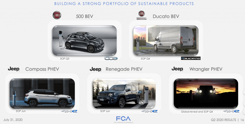 The Jeep Wrangler 4Xe is one of five electrified new vehicles FCA is rolling out this year. The company recently started production of the Jeep Compass 4Xe and Jeep Renegade 4Xe for Europe. A new full battery electric Fiat 500e is coming in Q3 2020 (which is about now). There is also an all-electric Fiat E-Ducato commercial van lineup that is starting production for Europe in Q4 2020.