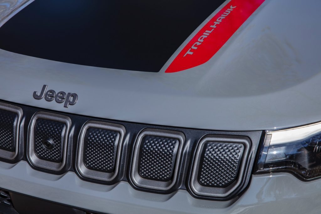 The Compass Trailhawk, for its part, gets more distinct touches to set it apart. The design goal here was to make the off-road and on-road versions distinctive from each other, and to that end the Trailhawk gets the red and black anti-glare hood decal and a matte black “Jeep teeth” grille. The middle grille is proportionally larger here (again, to handle cooling by maximizing airflow), and there’s a front skid plate to buttress the matte black lower fascia.