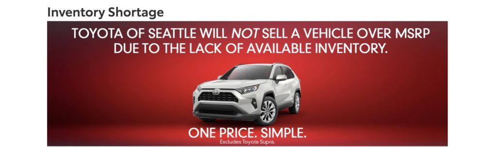 Toyota of Seattle straight up says it — “We will not sell a vehicle over MSRP*”