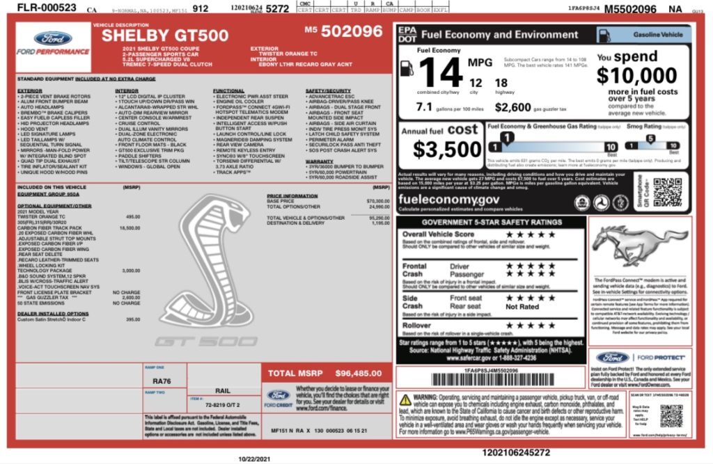 The reader who sent in this example kindly provided a copy of the car’s Monroney (sticker) below. It does indeed show that Ford’s MSRP for the vehicle — with $24,990 in options, mind you — is indeed $96,485. Could you stomach paying a 24% premium above and beyond that to have a GT500?