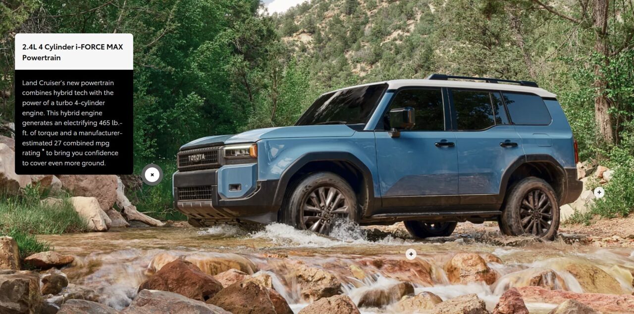 One key difference between the Toyota Land Cruiser and Lexus GX 550 lies under the hood. The new Land Cruiser, for its part, packs a hybridized 2.4-liter four-cylinder shared across a wide range of models including the new Tacoma. In this application, the “i-Force Max” powertrain puts out 326 horsepower and 465 lb-ft of maximum torque. The Land Cruiser uses an 8-speed automatic transmission and can tow up to 6,000 pounds, according to Toyota’s official specs.