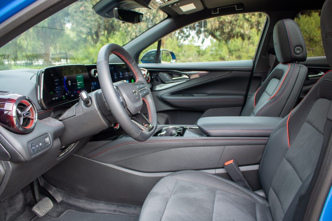 Two of the best features of the 2024 Chevy Blazer EV’s interior are the gear selector stalk and the HVAC vent design. GM is moving to a column-style shifter rather than a push-button system, and while it’s electronically controlled, it does feel more satisfying than just pushing a button to get going. The red inlays for the vents on the center stack and the upper portions of the instrument panel also bring a bit of spice to what otherwise would be a fairly utilitarian interior.