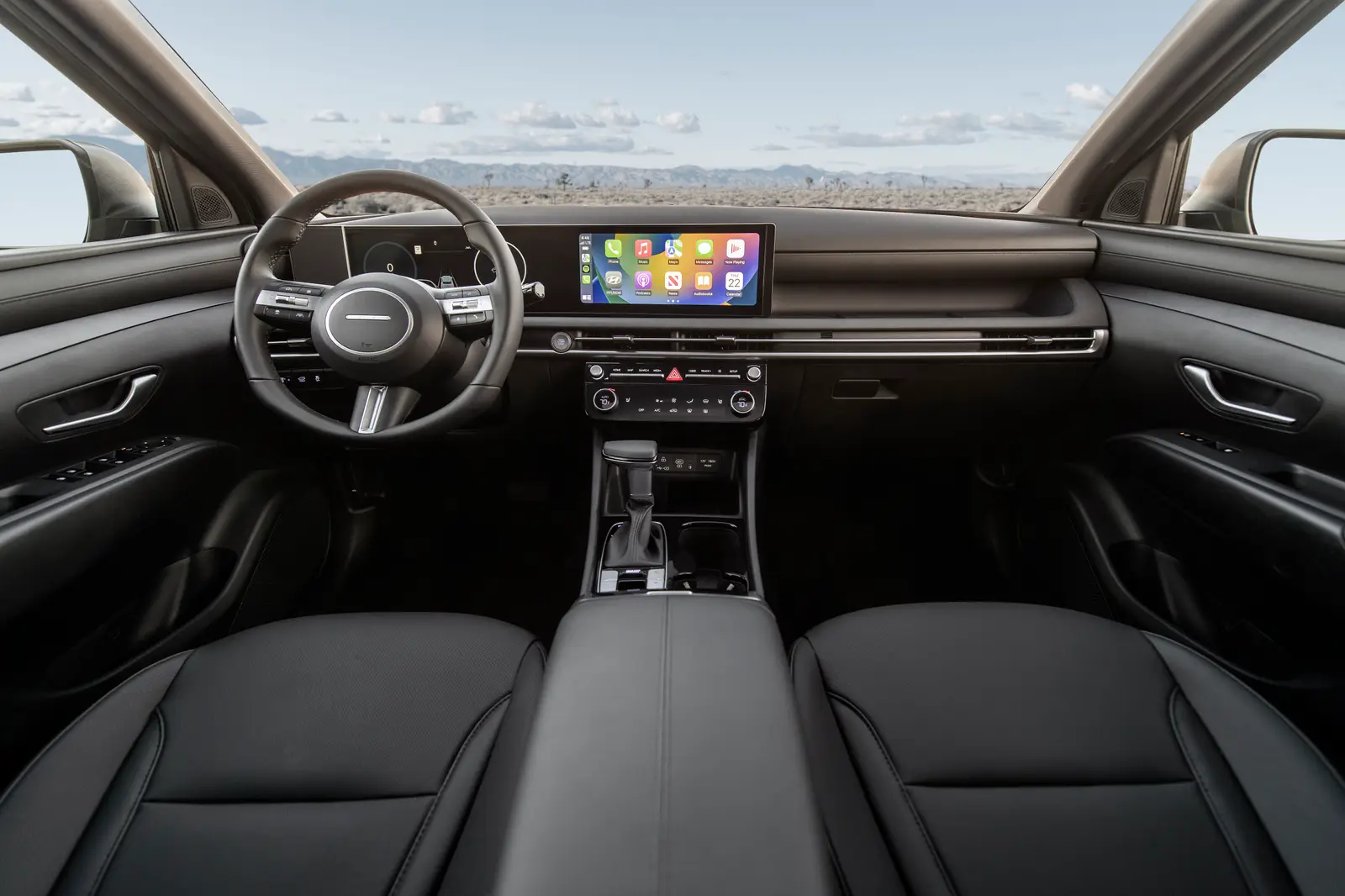 Inside, though, things are a bit different. The 2025 Hyundai Tucson adopts a pair of 12.3-inch screens for the digital gauge cluster and infotainment system. Wireless Apple CarPlay and Android Auto are available across the range, while the latest model also gets a column-mounted gear selector (like the Santa Fe as well as the electric Ioniq models) on higher trims, and a redesigned center stack with touch-sensitive climate controls.