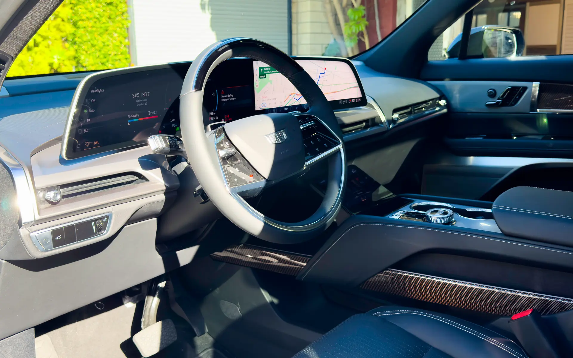 As far as charging capability, the Vistiq uses the same 400-volt architecture as the brand’s other (non-truck-based) SUVs. To that end, you get up to 79 miles of range while DC fast charging in about 10 minutes, under ideal conditions. Again, that’s similar to other EVs in GM’s stable, working out to about 190 kW of DC fast charging capability. On Level 2 AC charging at 11.5 kW, Cadillac says you’ll be able to charge up at the rate of about 28-1/2 miles for each hour (or 20.5 miles per hour on a 7.5-kW AC charger). The Vistiq can also handle “vehicle-to-home” or bidirectional charging, so you can use the car as a sort of emergency power station, provided your home’s electrical system is set up accordingly.