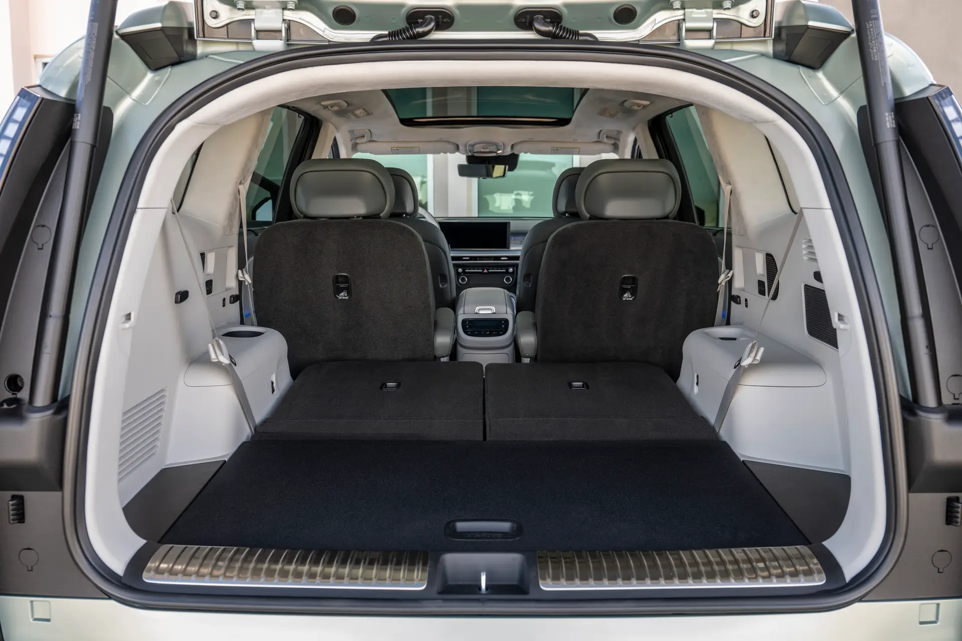 Pushing the wheels out closer to the edges amounts to more passenger space in the cabin as well as better cargo volume, both of which are plentiful on first inspection. Hyundai notes the 42.8 inches of second-row legroom is class-leading against two of the company’s targeted rivals with this vehicle, the Tesla Model X and Rivian R1S. At 32 inches of legroom on the third row, the Ioniq 9 also beats the Palisade as a roomier option. As far as cargo space is concerned, this electric SUV manages a decent 21.9 cubic feet with all seats in place, and 46.7 cubic feet with the second row folded.