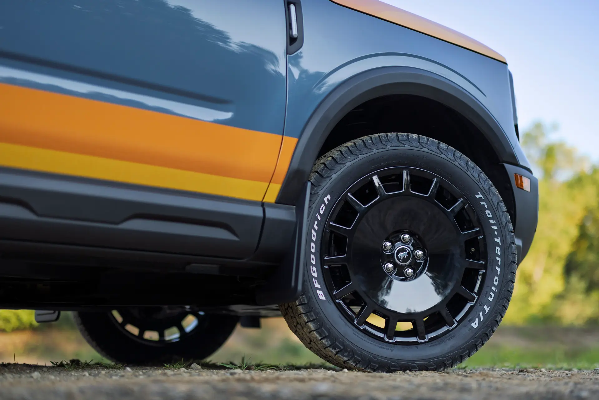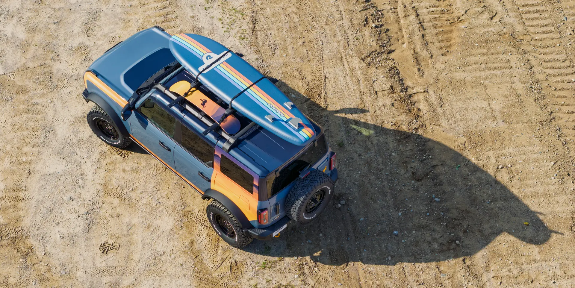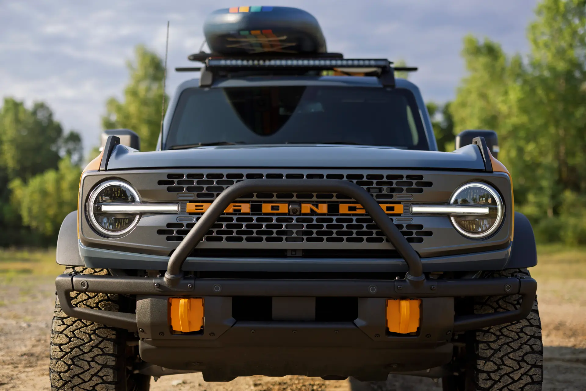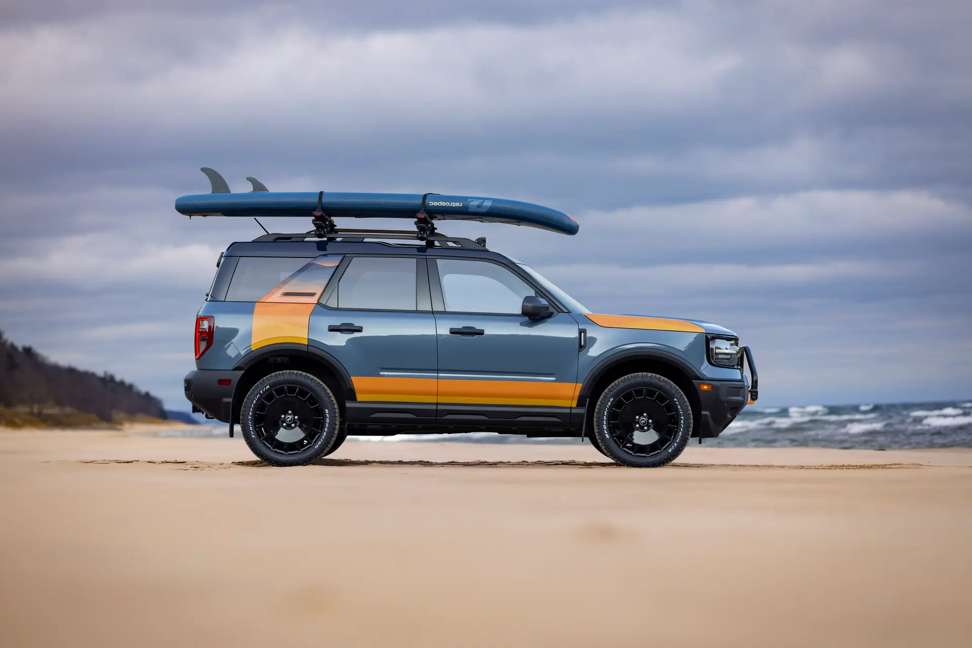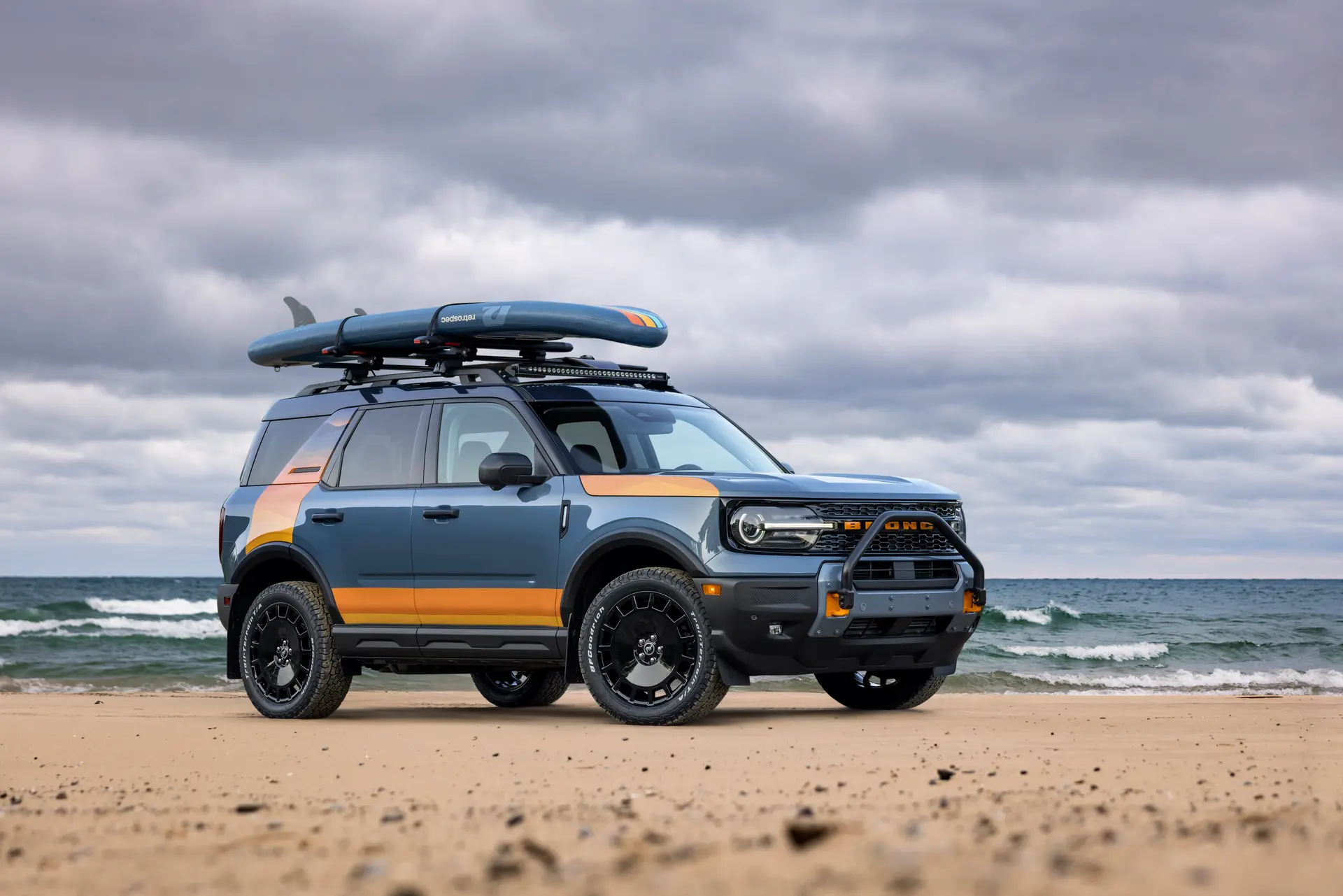 Both SUVs bring in custom orange graphics fitted over Acure Gray paint, meant to show the tones of the sky and water at the Silver Lake Sand Dunes. The big Bronco, for its part, gets a set of black-painted heritage wheels wrapped in BFGoodrich T/A KO3 tires. The Bronco Sport gets Mustang Mach-E Rally wheels with BFGoodrich Trail-Terrain T/As. The cross bars and Yakima paddle board carriers, and the Rigid light bars all come from the Ford Performance parts catalog, as does the bull bar on the Bronco (it comes standard on the Bronco Sport Sasquatch for 2025).