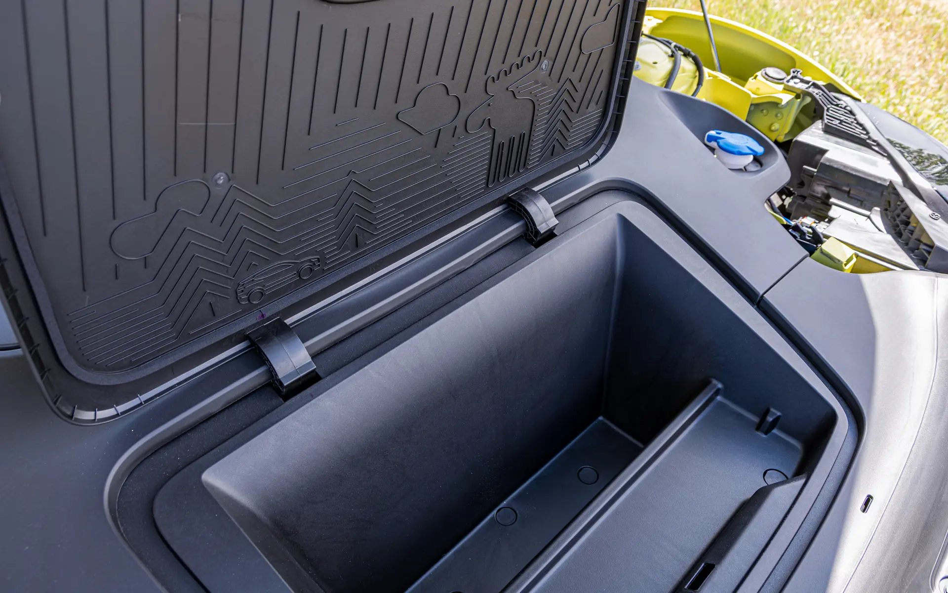 The small EX30 does struggle for storage space, but you do get a drop-down glovebox that drops down from the center of the dash, a wireless smartphone charger, a storage cubby with two USB-C ports and more pop-out storage from the center console. There’s also a useful top plate that allows that sliding area to be used as general purpose storage or as two cupholders. Under the hood, the EX30 does have a small frunk with a fun Swedish Easter egg, which is better than nothing at all.