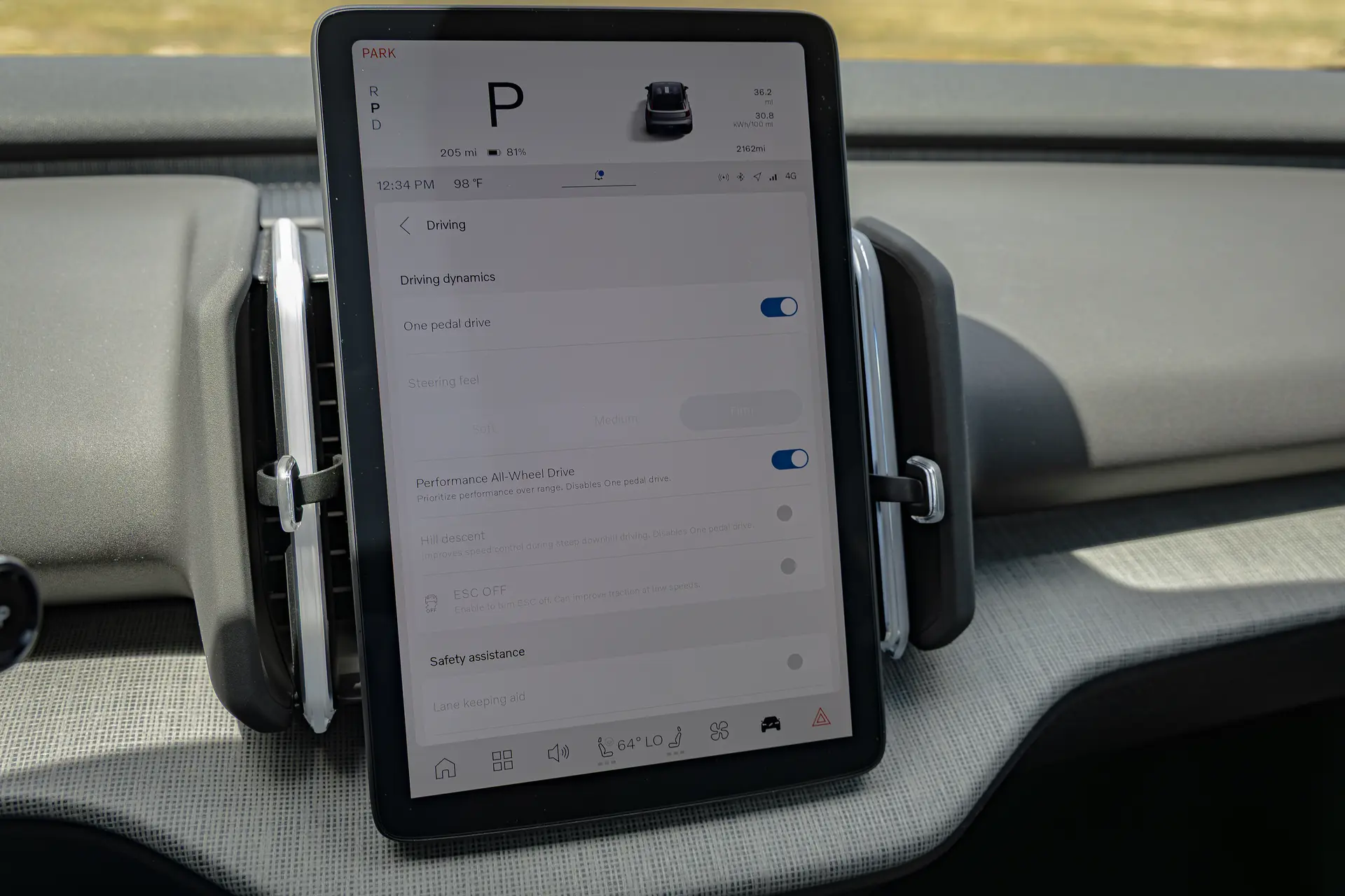 According to the sliders in the vehicle settings, too, selecting “Performance All-Wheel Drive” is supposed to disable one-pedal drive. Physically, it does, but the actual one-pedal drive settings remain enabled, suggesting that it’s still active both on the vehicle settings menu and in the “Quick controls” menu. Then there are the lane-keep assist and the infuriatingly pervasive driver monitoring system that will bong at you if your eyes aren’t dead center on the road at all times. Yes, you can turn them off, but they always come back when you power-cycle the car.