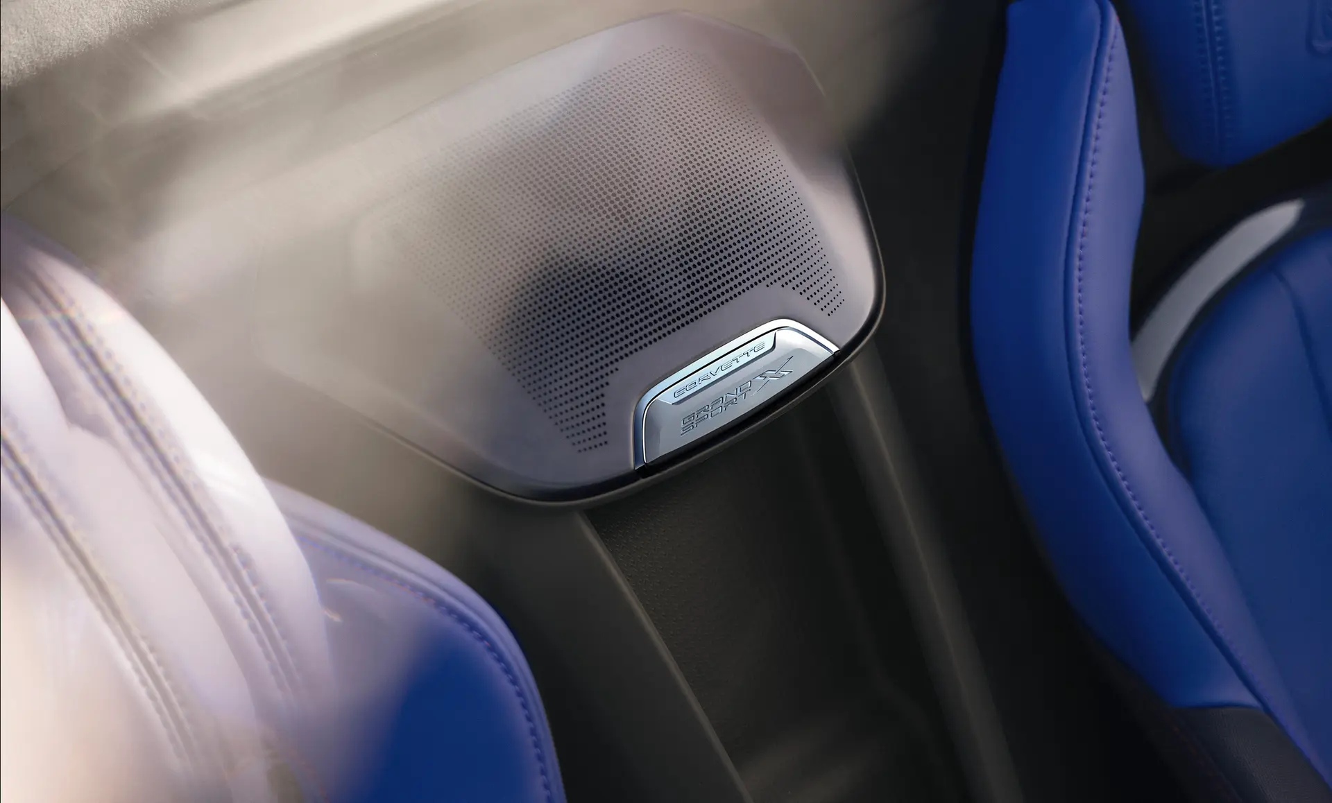 The 2027 Chevy Corvette Grand Sport will also offer up a Launch Edition interior package that is, to put a finer point on it, extremely blue. And if a certain song mentioning a blue Corvette just popped into your head, you’re not alone there. Nearly every interior surface is Santorini Blue, apart from the red stitching and seat belts. The Launch Edition models further get embroidered headrests, while the leather-wrapped cowl over the gauge cluster gets a red accent down the center, lining up with the center mark on the steering wheel. Finally, a waterfall speaker plaque on the back of the center console and a special Grand Sport steering wheel badge complete the look for the early-spec Grand Sport models.