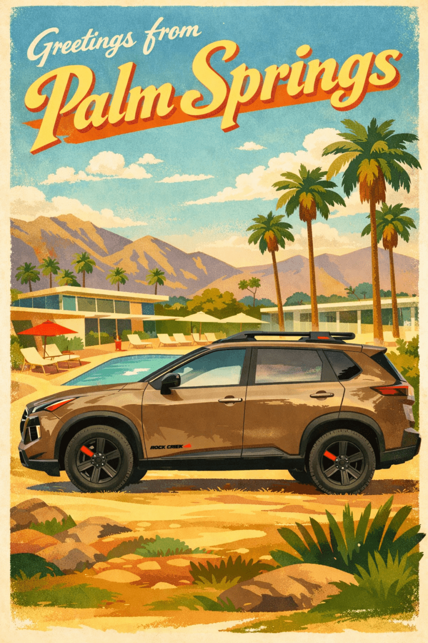 Leaving the South Bay in Southern California, the drive to Palm Springs took about three and a half hours in a 2025 Nissan Rogue Rock Creek Edition. It’s a great little ride, though there are a few compromises. Fuel economy was excellent, I was seeing well over 30 mpg on the trip, and the power is decent. That said, passing power at highway speeds leaves a little something to be desired.