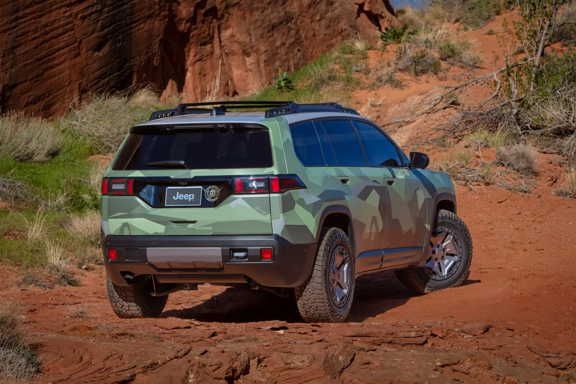 The larger tires compared to the old Cherokee KL’s 29.5-inch setup does get you a bit more clearance. The Cherokee Upland also sports an interesting camo wrap, but the distinctive gloss black front end may be another way to tell the production-spec Trailhawk apart from its stablemates. At the back, you get a “Design Operations – Jeep Division” decal as a cool nod to the folks who are putting a more dirt-worthy Cherokee together. While we hope this model gets some more serious off-road goodies beyond what’s shown here to improve its capability over the standard SUV (which struggled in our off-road testing), we’ll have to wait and see for more details on a production model.